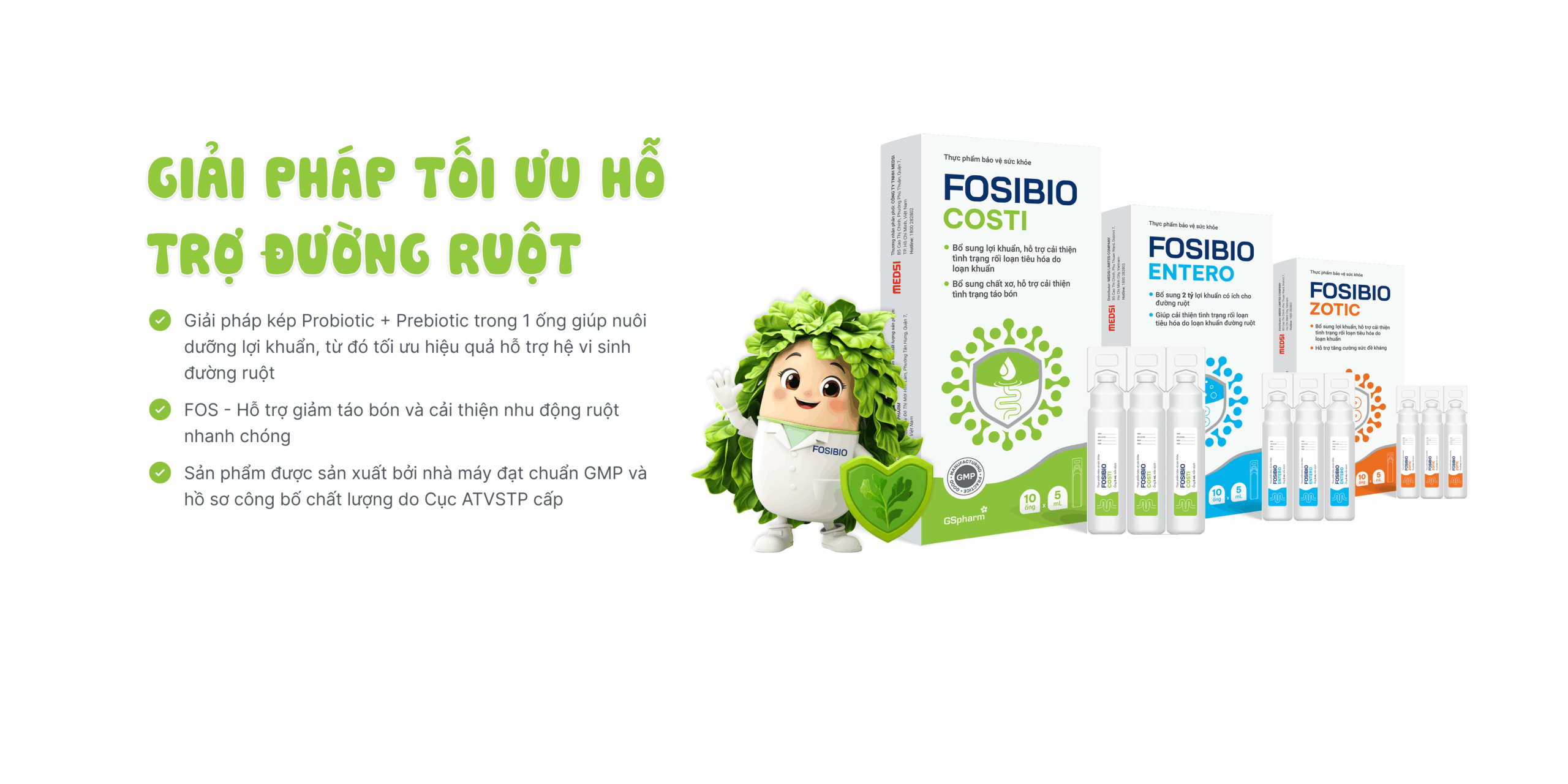 Men vi sinh nước FOSIBIO - với 03 dòng sản phẩm chuyên biệt cùng công thức độc đáo, giúp đáp ứng toàn diện nhu cầu chăm sóc hệ tiêu hóa cho cả gia đình. Không những giải quyết nhanh chóng các triệu chứng rối loạn tiêu hóa, mà còn cải thiện tình trạng táo bón hiệu quả, giúp